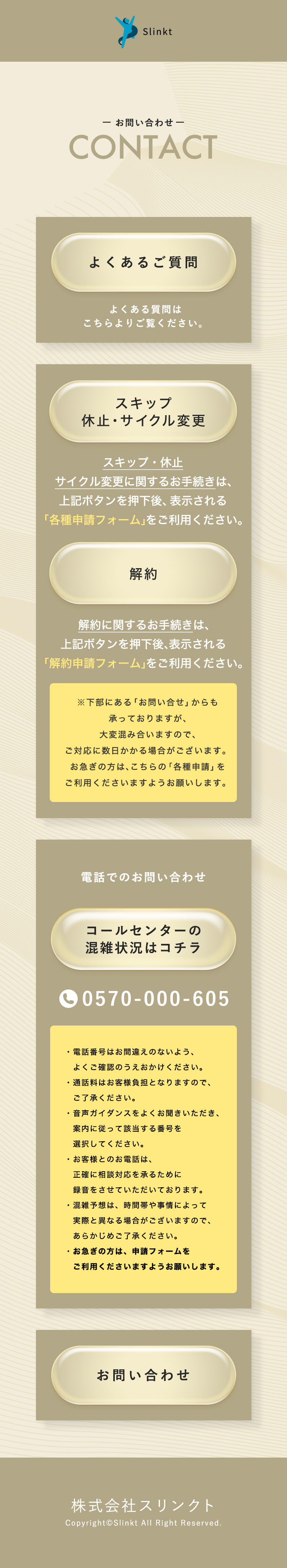 TOP TOP お知らせ お問い合わせ 特定商取引法について よくあるご質問 スキップ・休止・サイクル変更 解約 コールセンターの混雑状況はコチラ お問い合わせ TOP お知らせ お問い合わせ 特定商取引法について よくあるご質問 スキップ・休止・サイクル変更 解約 コールセンターの混雑状況はコチラ お問い合わせ